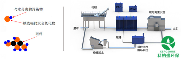 通過向原水中投加專用磁種,使磁種在凝聚劑和絮(xù)凝(níng)劑的作用下與(yǔ)原水中的懸浮物結合在一起形成磁性微絮團(磁性絮團是以(yǐ)磁種作為核的磁種與懸浮物(wù)的混合體),在混凝係統的後段生成以磁(cí)種為“核(hé)”的(de)懸浮物混合體,經超磁分(fèn)離機裏的稀土永磁體產生的高強磁力實現磁性絮團與水的(de)快速分(fèn)離,達到水(shuǐ)質淨化目的。