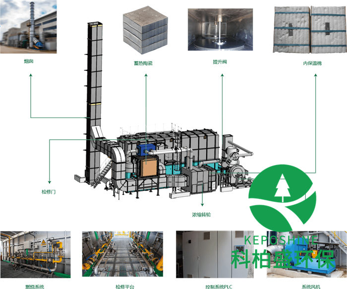 其主要特征是:蓄熱床底部(bù)的(de)自動控製閥分別(bié)與進氣總管和排氣總管(guǎn)相(xiàng)連,蓄(xù)熱床(chuáng)通過換向閥交替換向,將由燃燒室出來(lái)的高溫(wēn)氣(qì)體熱量蓄留,並預熱進入(rù)蓄熱床的有機廢氣;采用陶瓷蓄熱材料吸收、釋放熱量;預熱到一定溫度( ≥ 760℃ )的有機(jī)廢氣在燃燒(shāo)室發生氧化反應,生(shēng)成二氧化碳和水,得到淨化。