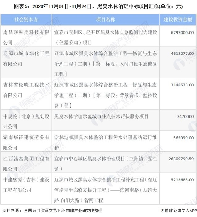 全國公共(gòng)資源交易平台數據顯示,2020年11月01日-11月24日,共15起社會資本中標黑臭水體治理項目,投資額總計8939.69萬元,其中,包含6個黑臭水體整治項目。