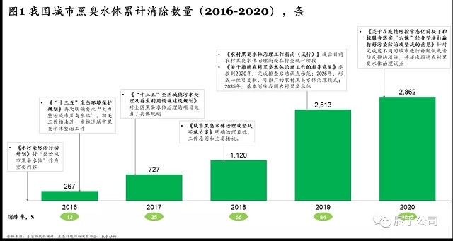 自2015年4月國務院發布實施《水(shuǐ)汙染防治行動計劃》將“整治城市黑臭水體”作為重要內容,到2016年《“十三五(wǔ)”生態環境保護規劃(huá)》明確要求“大力整治城市黑臭(chòu)水體”,再(zài)到(dào)2017年《“十(shí)三五”全國城鎮汙水處理及再生利用設施(shī)建設規劃》對全國黑臭水體治理項目(mù)做出具體規(guī)劃(huá),以及2018年《城市黑臭水體治理攻堅戰實施方案(àn)》明確治理目標(biāo)、工作原則和主要措施,我國城市(shì)黑臭水體(tǐ)治理在“十三五”期間取得了明(míng)顯成效,現(xiàn)已接近(jìn)尾聲。截至2020年底,我國(guó)累(lèi)計完成城市黑臭水體(tǐ)治(zhì)理2862條,消除率98.2%(見圖1)。