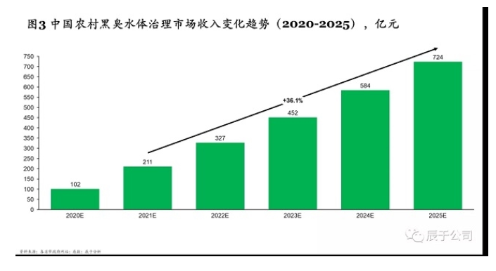 據辰於測算,如能按期達到上述目標,“十四五”期間我國農村黑臭水體治理市(shì)場將保持36.1%的年複合增長,到2025年達到(dào)724億元的收入規模(見圖3)