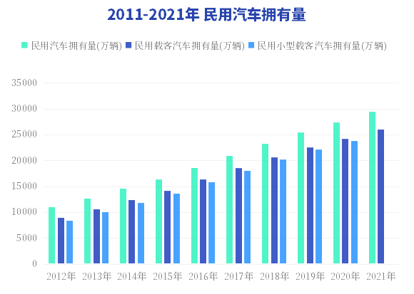 隨(suí)著人們生(shēng)活水(shuǐ)平的不斷提升,消費者們對(duì)汽車品質追求也逐(zhú)漸拔高(gāo),汽車產業正走向多元化(huà)、個性化發展階段。截(jié)至2022年3月底,我(wǒ)國汽車保有量3.07億(yì)輛,*統計局數據顯示,2021年,我國民用汽車擁有量29418.59萬輛,相(xiàng)較於2020年增加近兩千萬量,增(zēng)長率約(yuē)為7.6%。且從長線上看,我國近十年民用汽車擁有量(liàng)逐年增加。