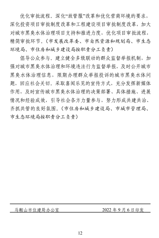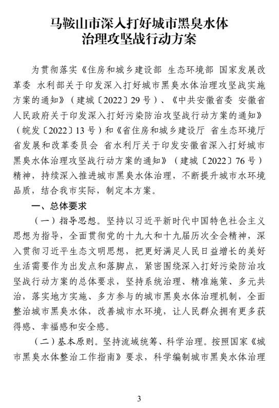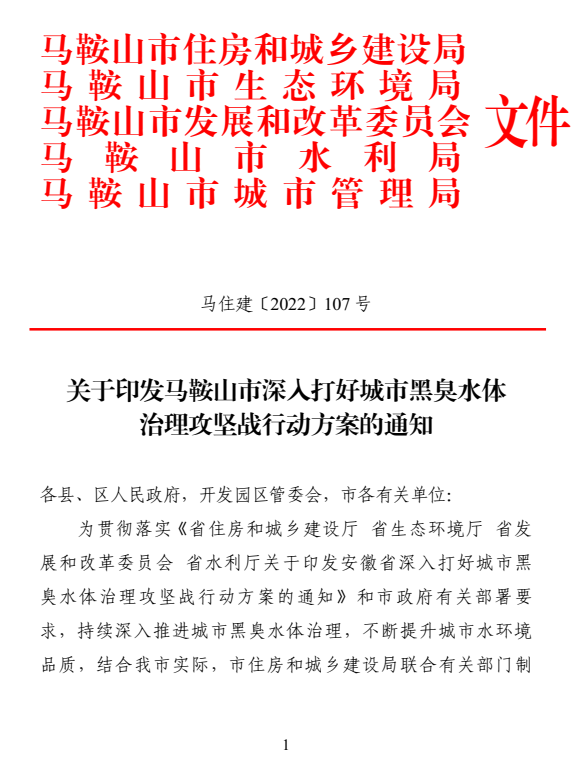 近日,安徽省馬鞍山市住房和城鄉建設局(jú)、生態環境局等(děng)5部門聯(lián)合印發《馬鞍山市深入(rù)打好城市黑臭(chòu)水體(tǐ)治理攻堅戰(zhàn)行動方案》,提出2023年(nián)消除比例達到80%,到2024年,縣城建成區基本消除黑臭水體,建立黑臭水體治理長效(xiào)機製。全(quán)文(wén)如下: