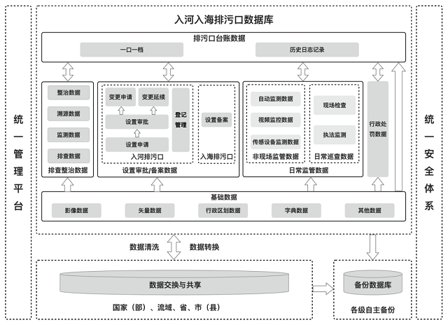 從(cóng)入河(hé)入海排汙口(kǒu)監督管理工作需求出發,提出了入河入海排汙口數據庫由基礎信息、排查整(zhěng)治、設置審批(pī)/備案(àn)、日常監測監管(guǎn)、行政處罰(fá)等五(wǔ)大類要素數據表組成(chéng),細分為基礎數據、排查數據、監測數據、溯源(yuán)數據、整治數據、入河排汙口設置申請與審批數據、入河排汙口登記數據、入海排汙口設置備(bèi)案數據、日常巡查數據、非現場監(jiān)管數據、行政處罰數據(jù)等十一小類要素,抽取匯聚成入河入海排汙(wū)口台賬。*(部)、流域、省、市 (縣)各層級數據庫基(jī)於統一的管理平台和安全體(tǐ)係,實現數據交換和共享。總體架構圖如圖(tú) 3 所示。