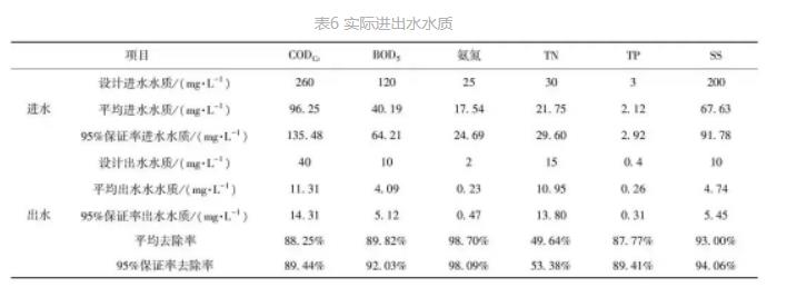 汙水(shuǐ)廠(chǎng)自2020年運行以來平均處理(lǐ)水量為37221萬m3/d,保證率(lǜ)為95%時處理水量為40411萬m3/d,水量負荷率為89.8%,實際進出水水質如表6所示。