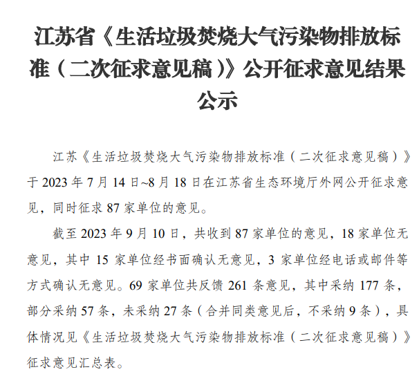 截至2023年9月10日,共收(shōu)到87家單位的意(yì)見,18家單位無(wú)意見,其中15家單位經書麵確認(rèn)無意見,3家單位經電(diàn)話或郵(yóu)件等方式確認無意見(jiàn)。69家單位共反饋261條意見,其中采納177條,部分采納57條,未采納27條(合並同類意見後,不采納9條(tiáo)),具體(tǐ)情況見《生活垃圾焚燒大氣汙染物排放標準(二(èr)次征求意見(jiàn)稿)》征求意見匯總表。