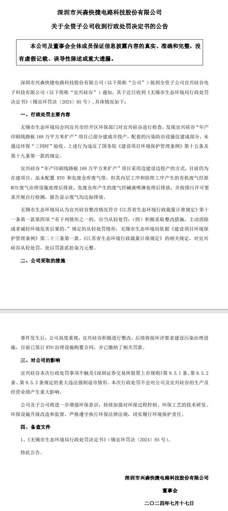 無錫市生態環境局認為宜興矽穀整改情況(kuàng)符合《江(jiāng)蘇省生(shēng)態環境行政裁量計準規定》第十一條第一款第四項“有下列情(qíng)形之一的,應當從輕處罰:(四)積極采取整改措施,主動消除或者減輕環境危害後果的,”規定的從輕處(chù)罰情形,無錫市生態環境局依據《建設項(xiàng)目環境保護管理條例》第二十三條第(dì)一款、《江蘇省(shěng)生態環境行政裁量計(jì)準規定》的相關規定,對宜興矽穀從輕處罰,處以罰款貳拾柒萬元整。